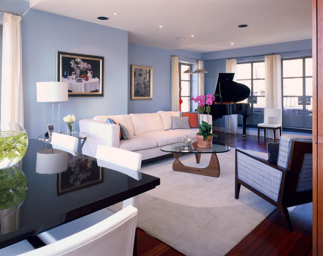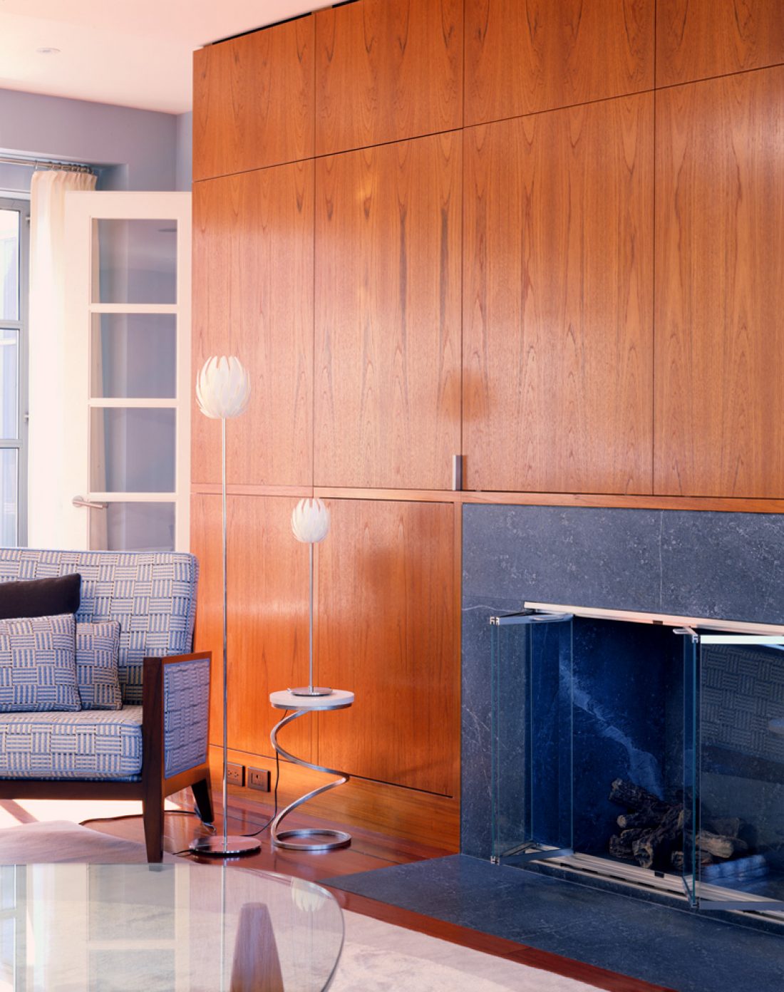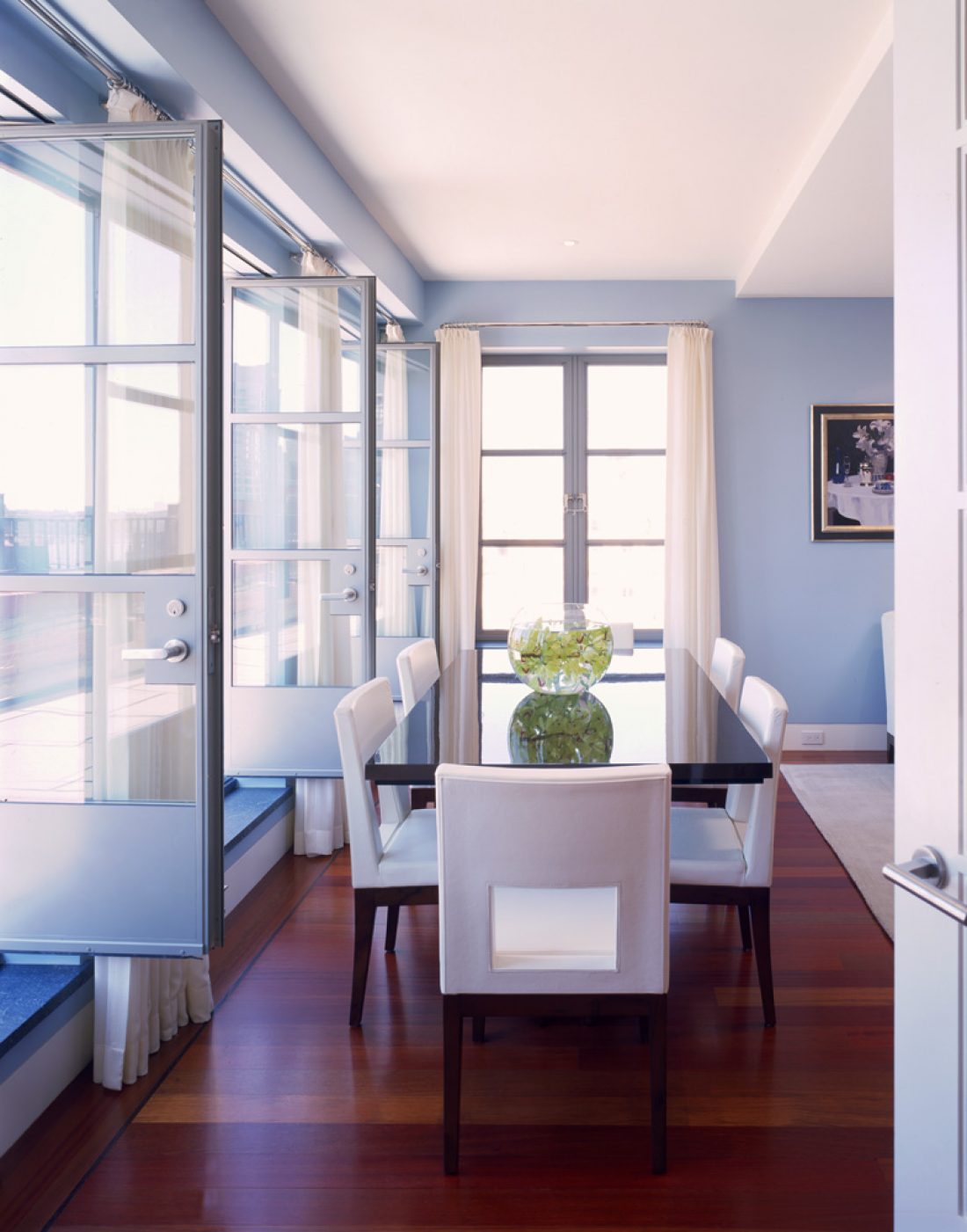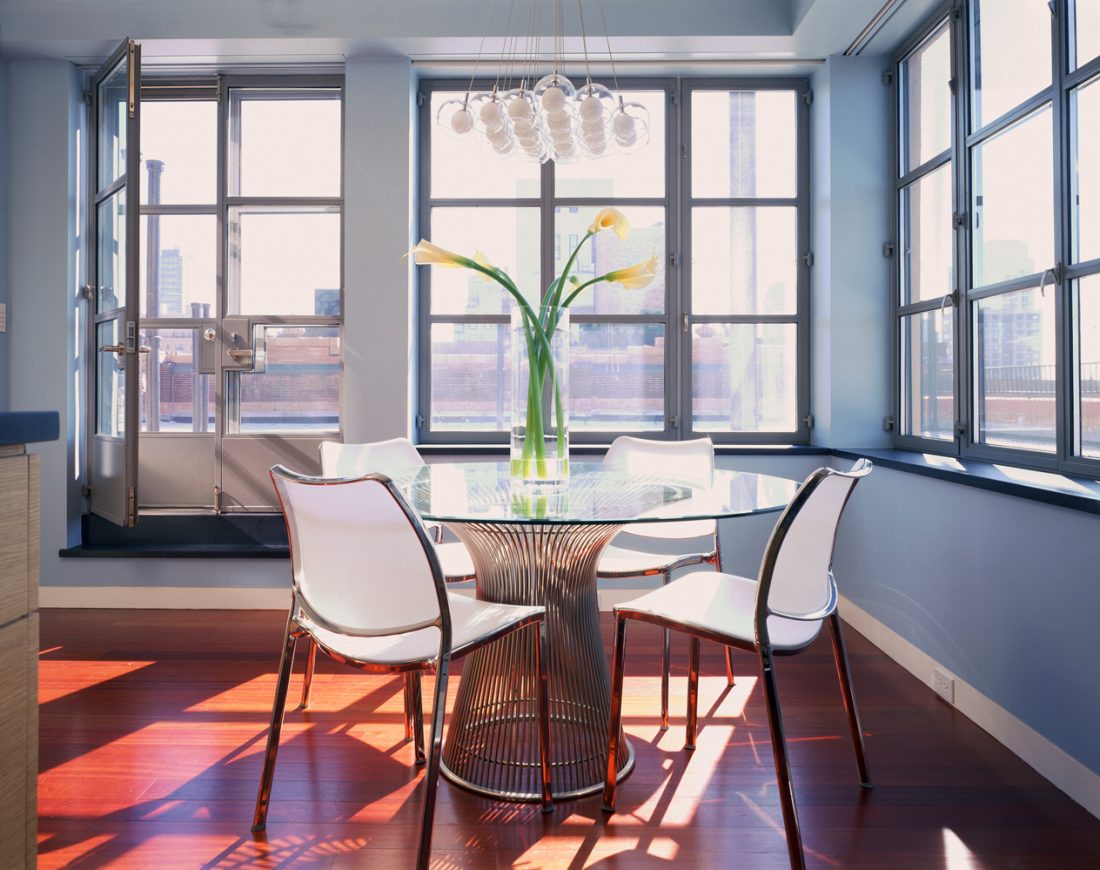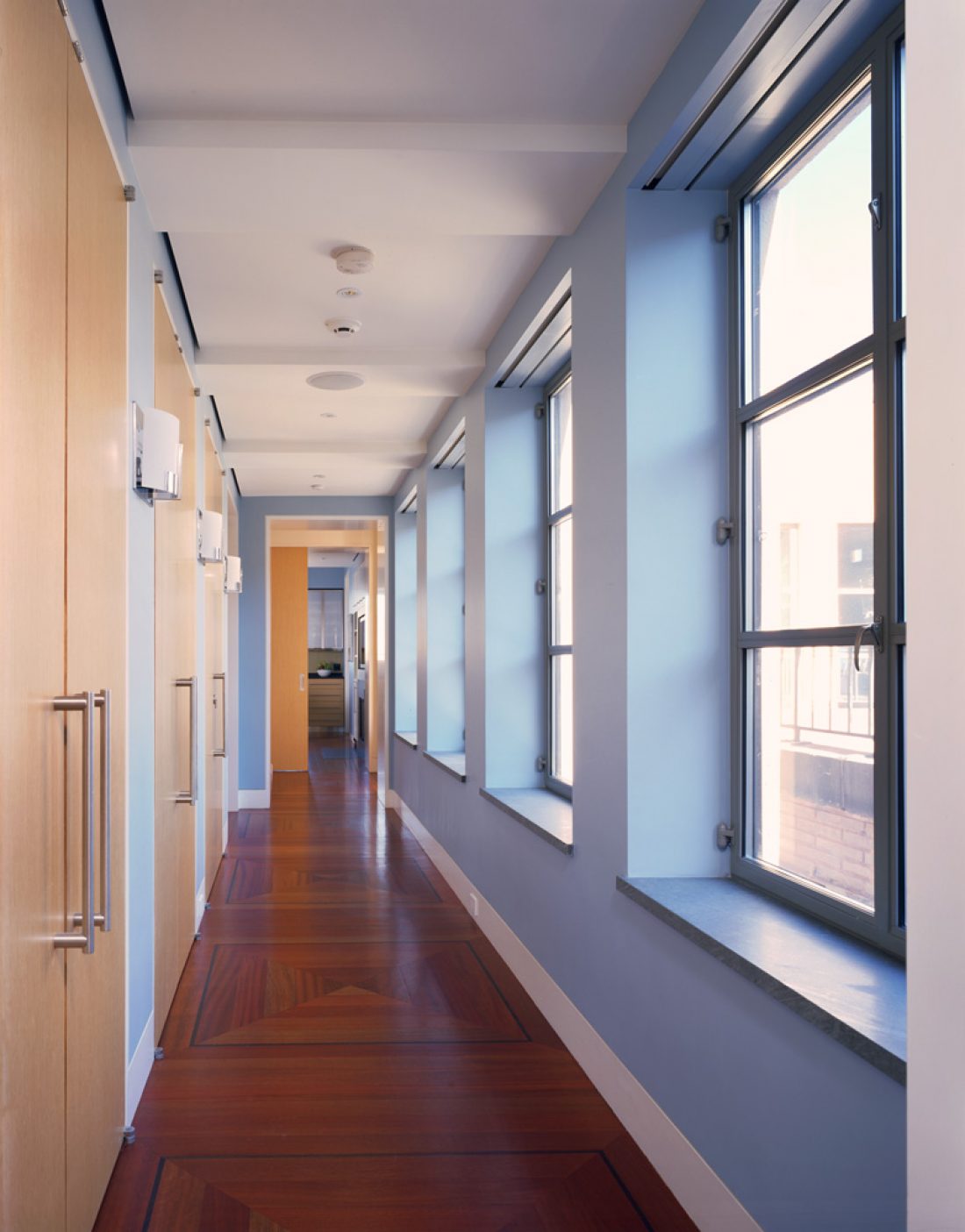 Two outdated penthouses were joined to make this spectacular apartment overlooking the Hudson River. A sequence of steel casement windows creates an elegant connection between the two apartments which spanned the entire East/West length of the building.