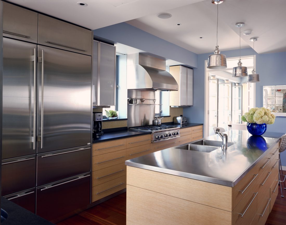 The kitchen is the apartment’s center of social activity. The bleached quarter sawn reconstituted white oak cabinets and stainless steel counters add to the uniqueness of this kitchen.