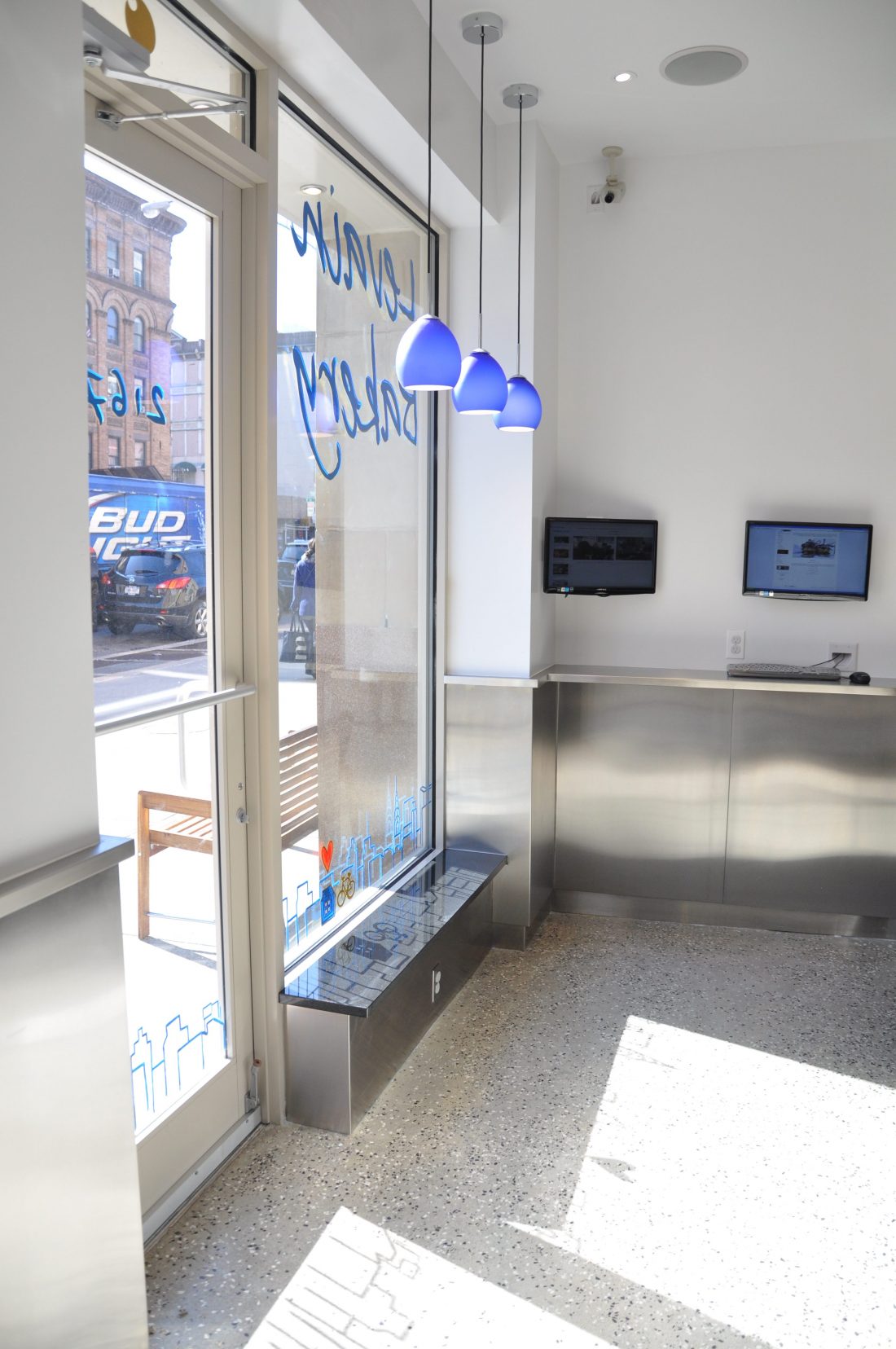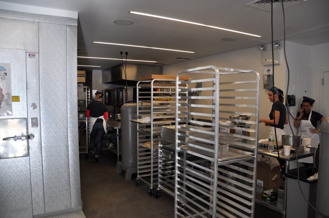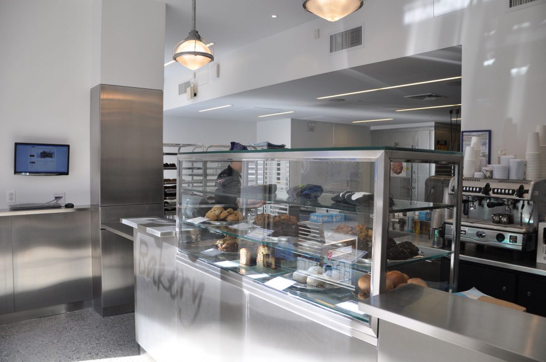 The new facility houses commercial grade ovens, walk-in refrigerators and major cooking appliances are all visible from the storefront cafe to create visual interest. A commercial grade dumbwaiter was installed to transport baked goods to the lower level packing area. Offices are located there as well. The aesthetic was no frills, high tech, and super clean. The cafe is a fun place to have a cappuccino and watch the production of the delicious baked goods.