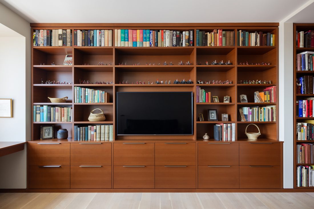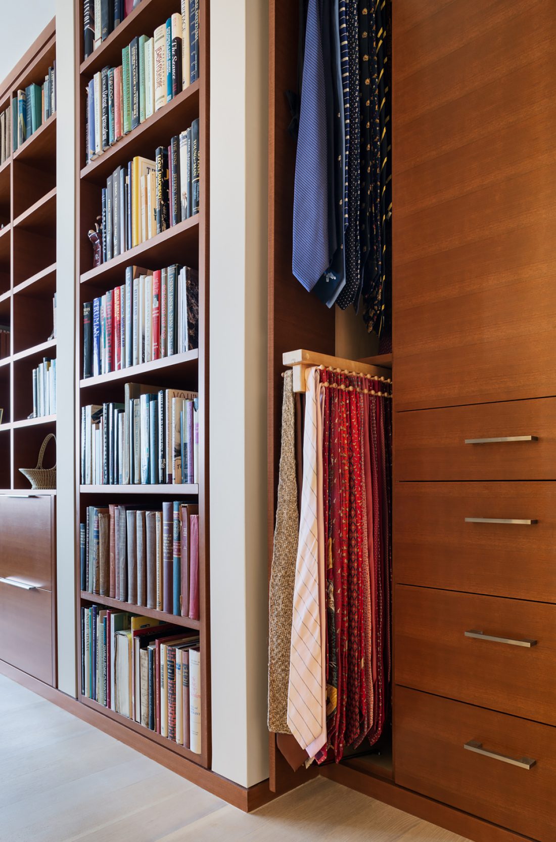 The meticulously designed woodwork provides a nook or a hook for every item.