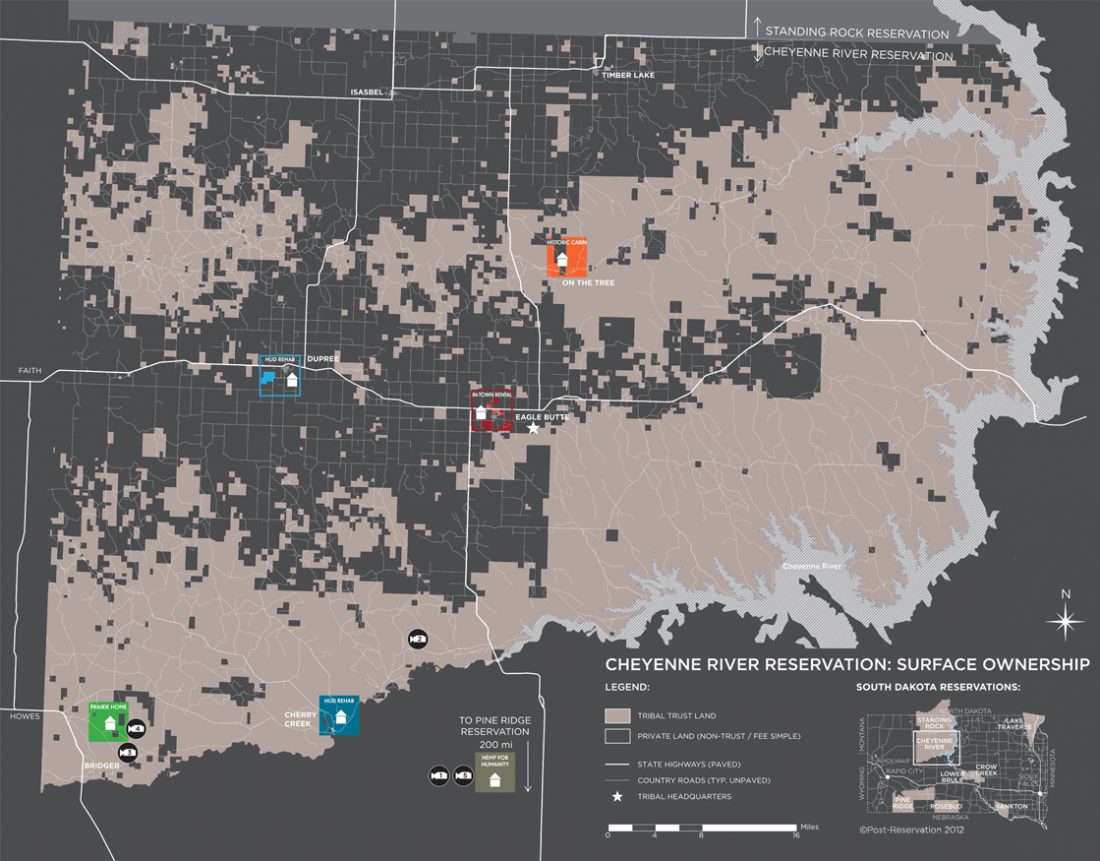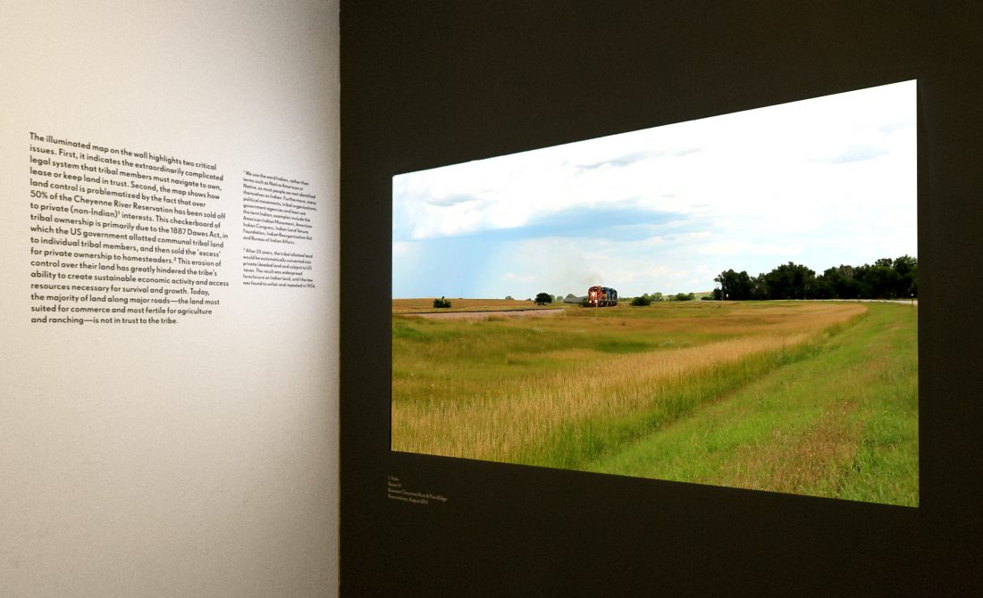 The exhibition tracks multiple scales—from the reservation, to the single home, to the individual. The map illuminates a complex checkerboard of land ownership within the boundaries of the Cheyenne River Reservation.