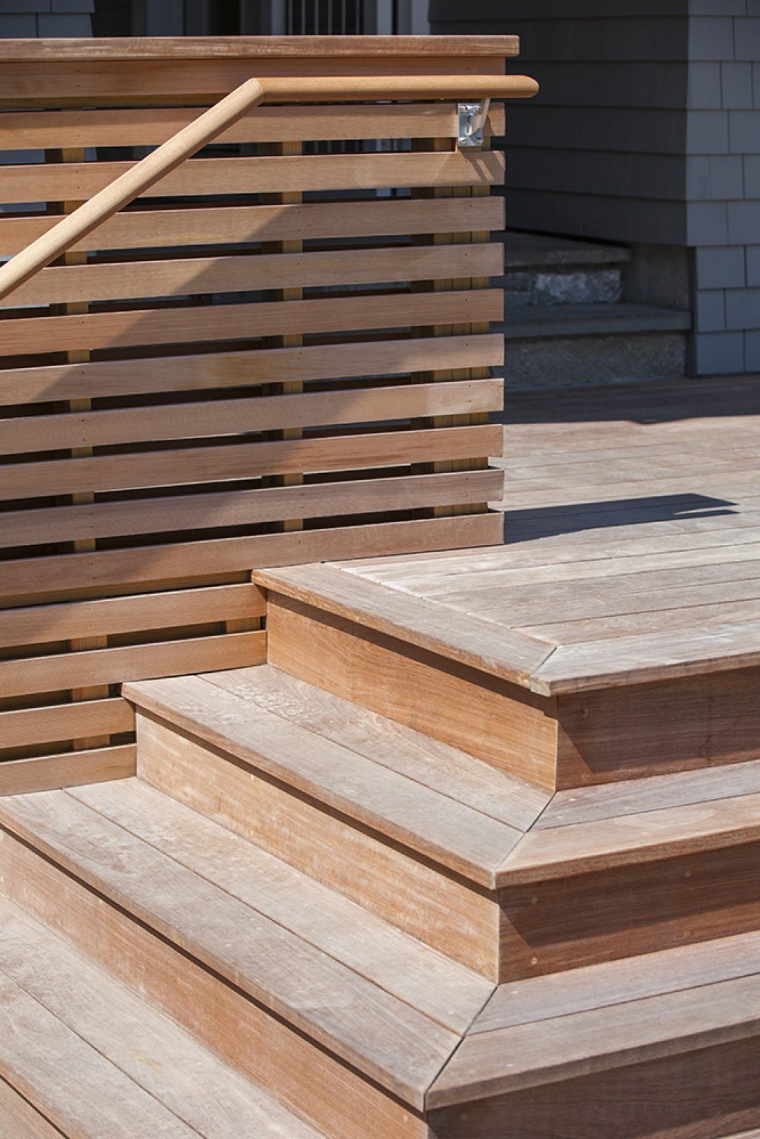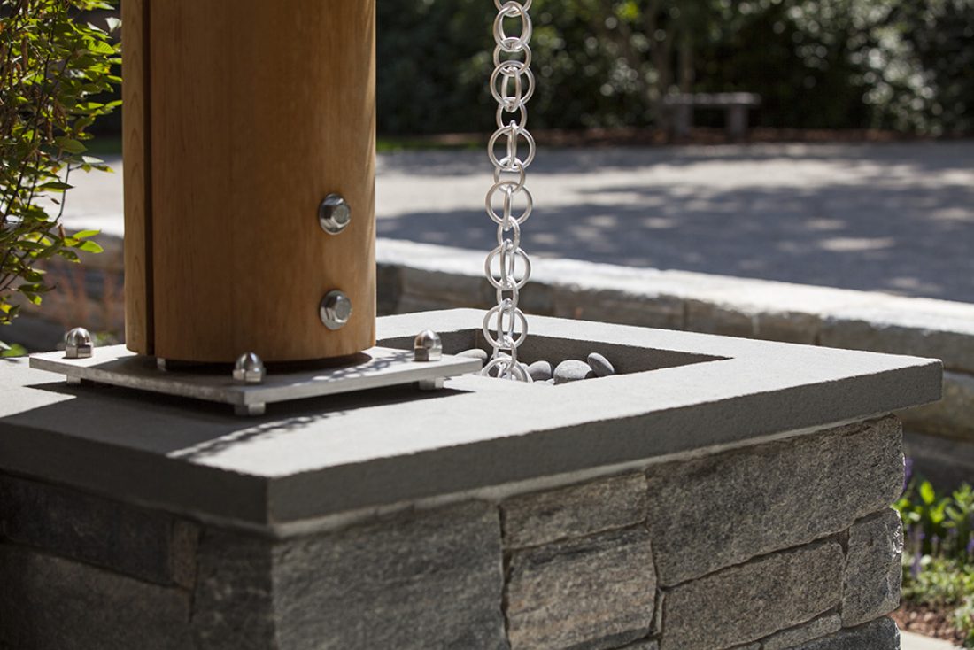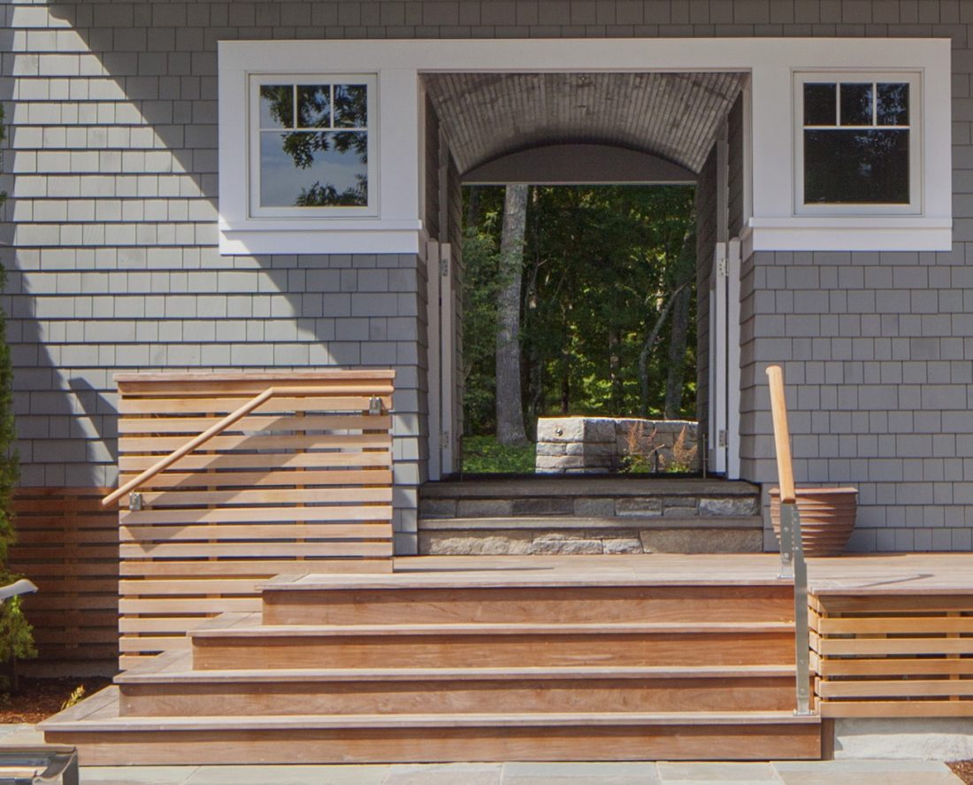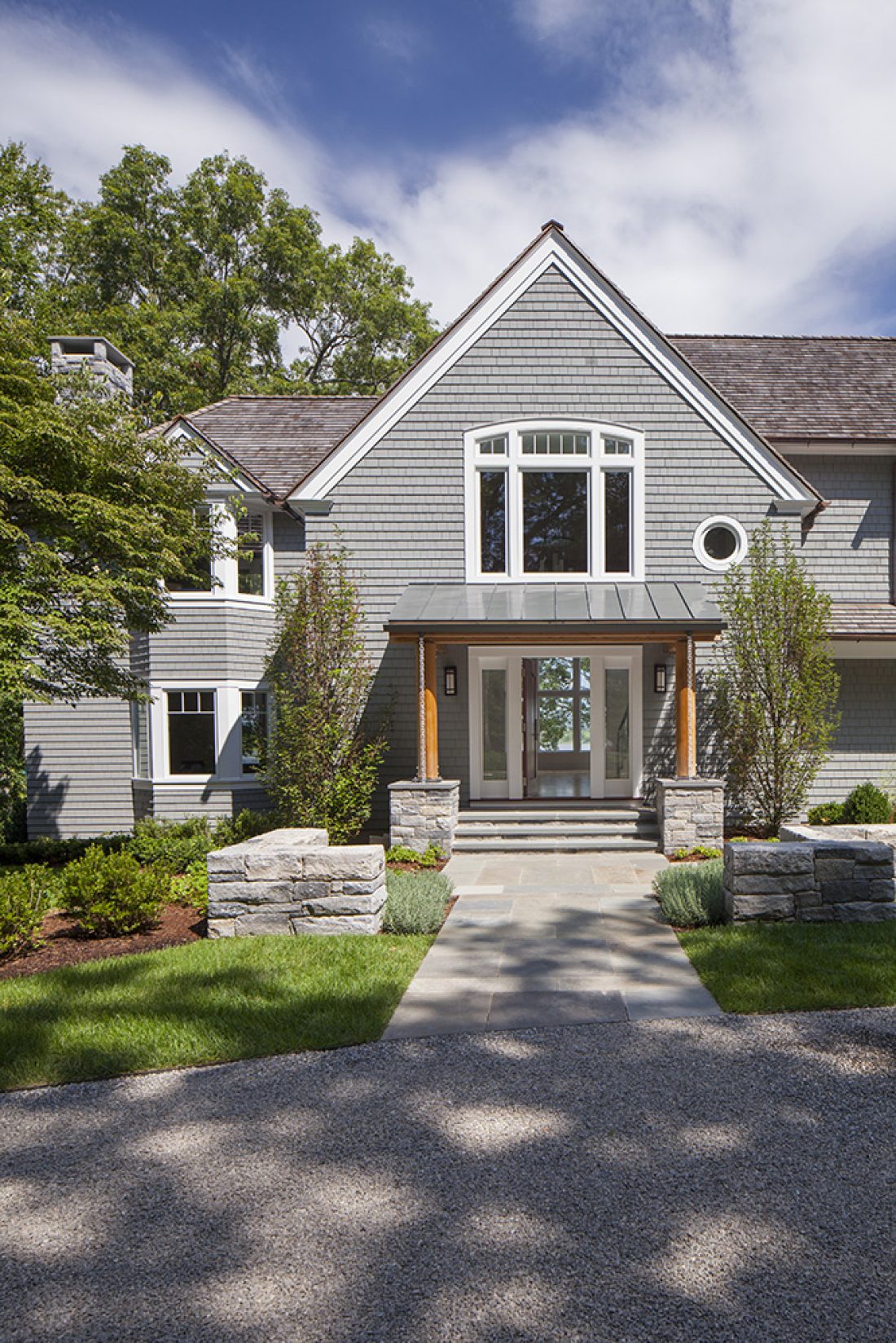 A magnificent home evolved by replacing siding, chimneys, roofing and windows. A lovely plateau was crafted from a sloping site, thus engaging the house with the site so there was easy flow in and out.