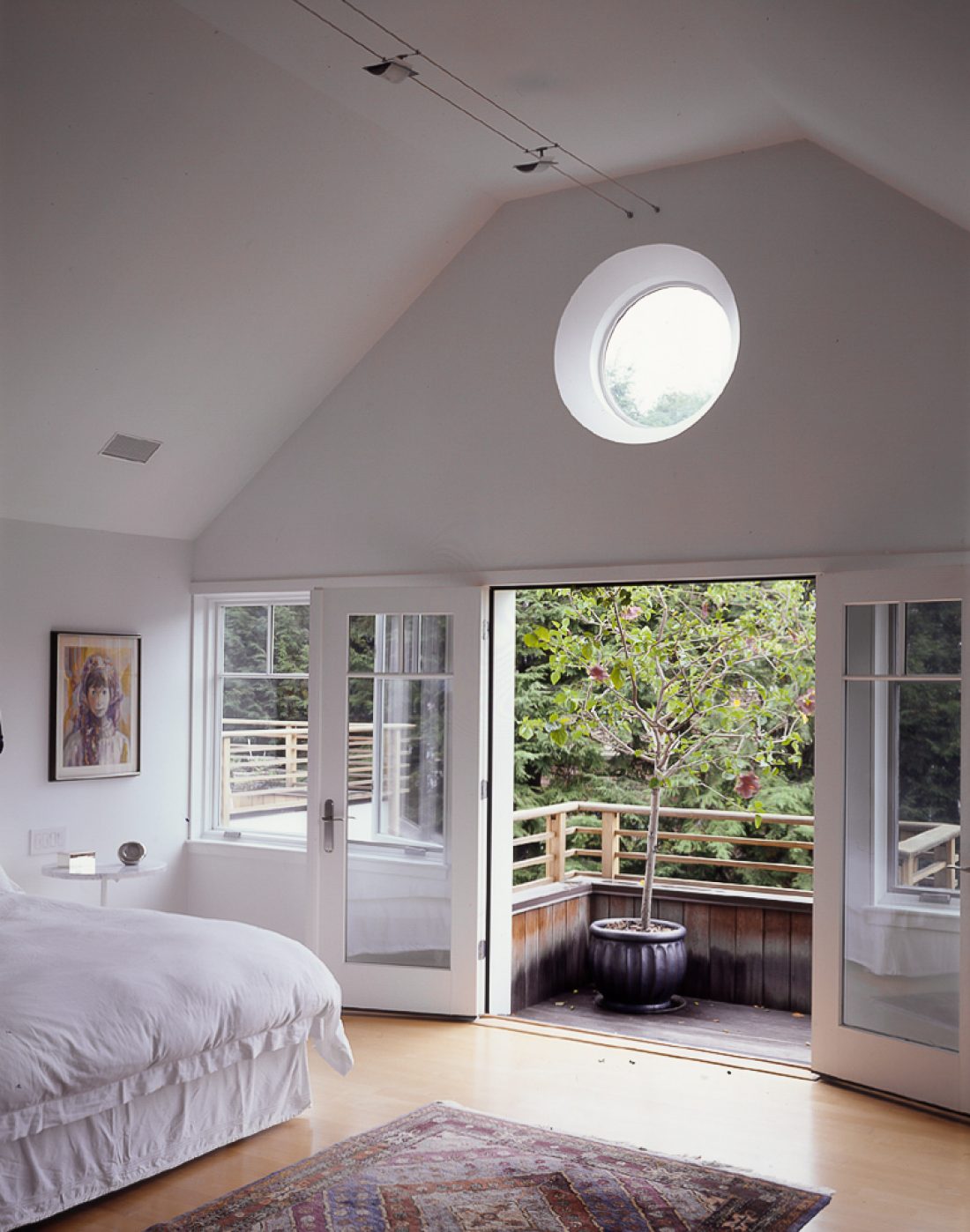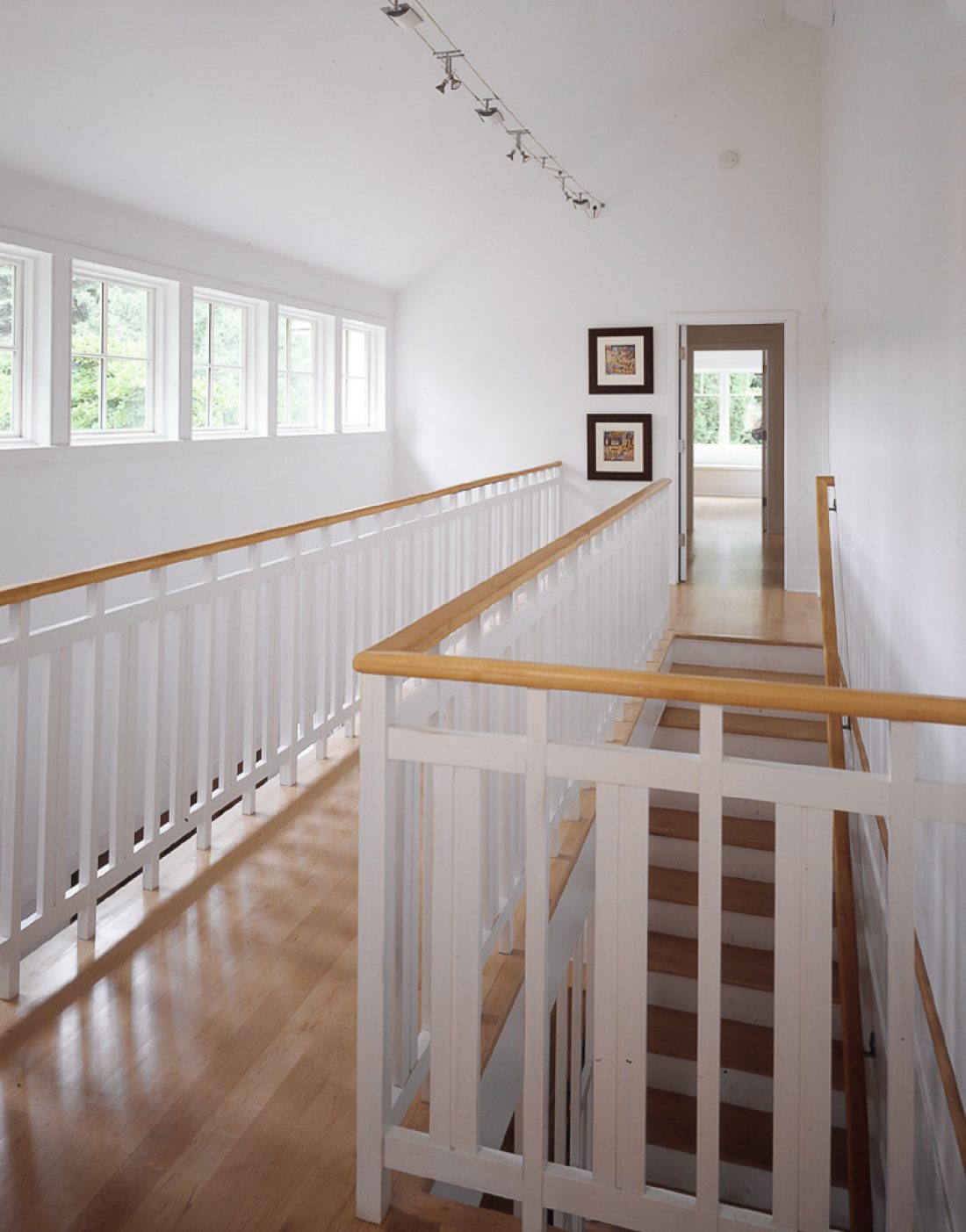 The second floor is created with dormers. A bridge on the second floor separates the master suite from the adult children’s area.