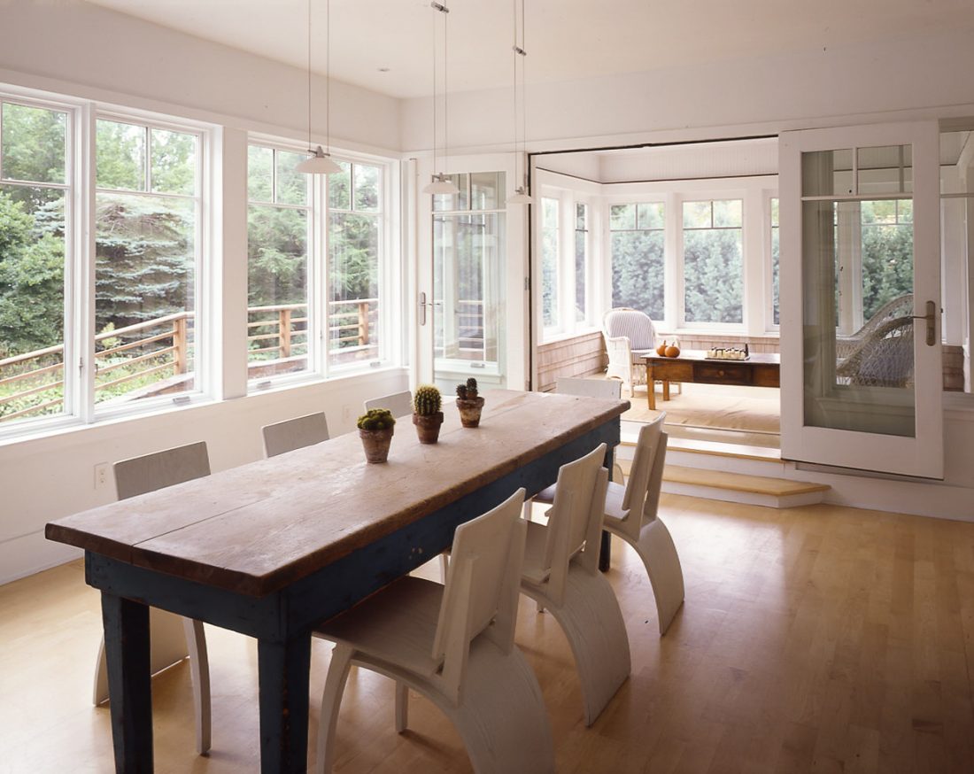The low roof line, which springs from the eave of the main living floor, masks the size of the gracious and spacious interior