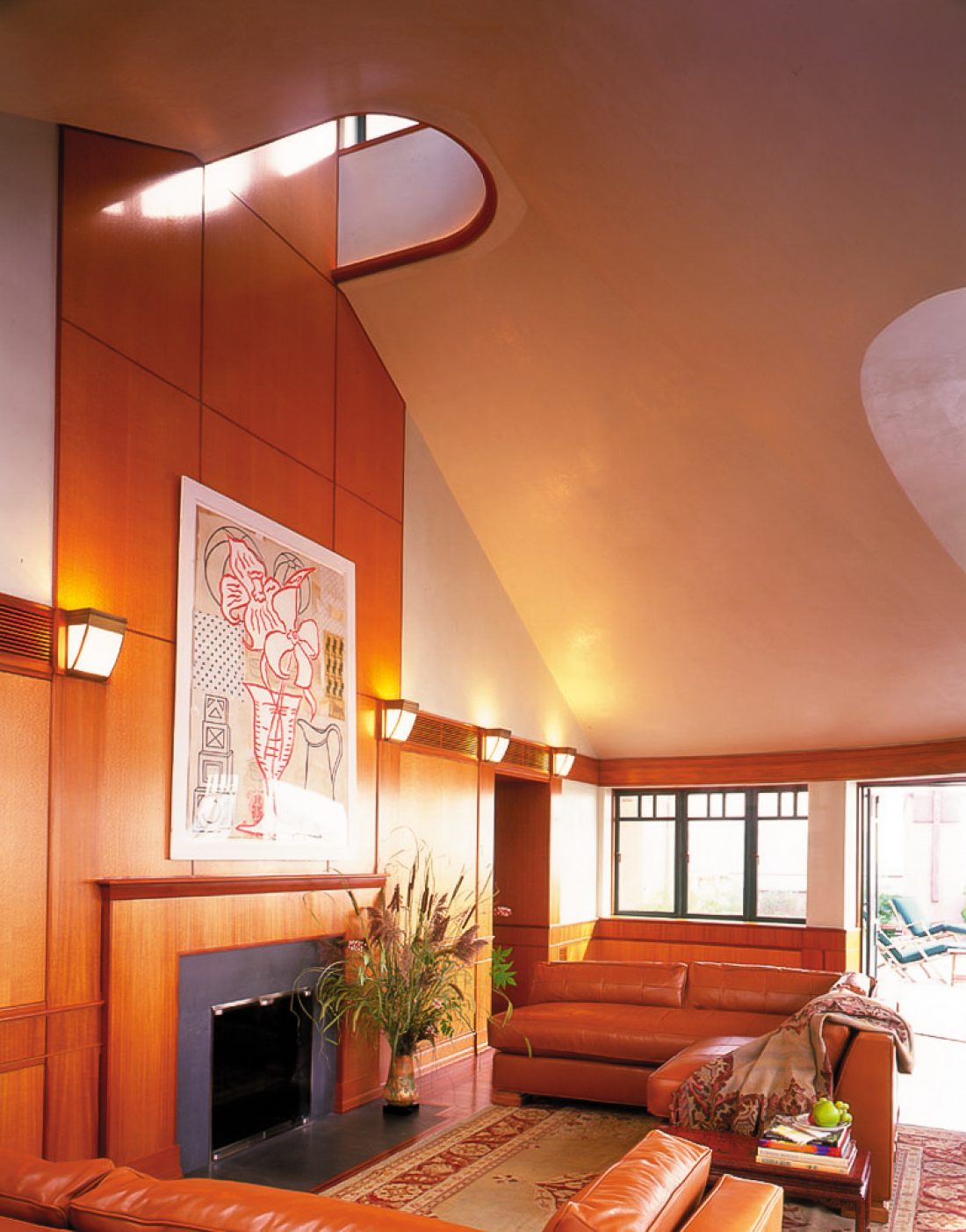 The multi-level plan rotates about a mahogany and brass central stair hall, which is illuminated by a skylight through glass plank floors above.