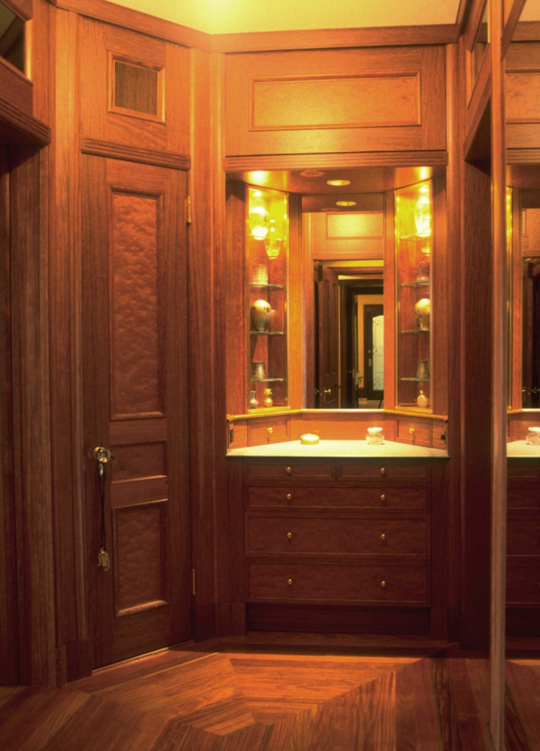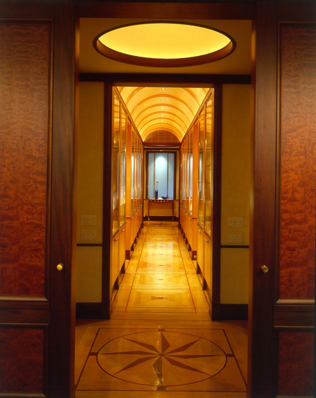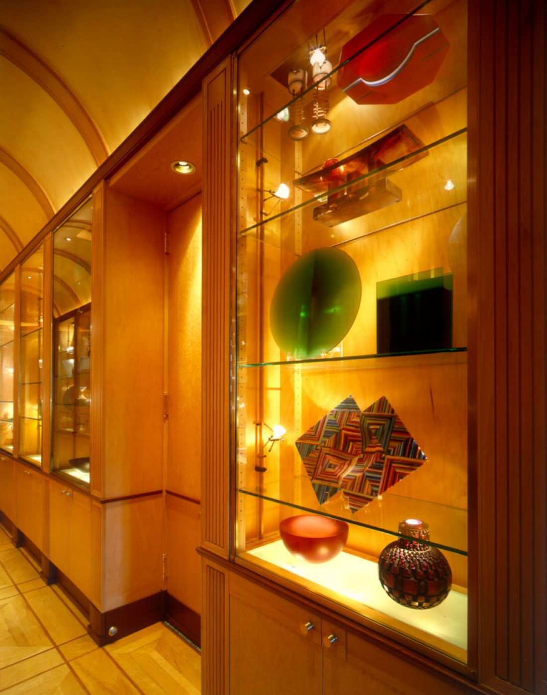 A contemporary glass collection display in a vitrine lined bedroom corridor/gallery, was the focal point of this design. The ceiling is vaulted and up lit; display cases are lit from the sides and bottoms of the glass cases as well.