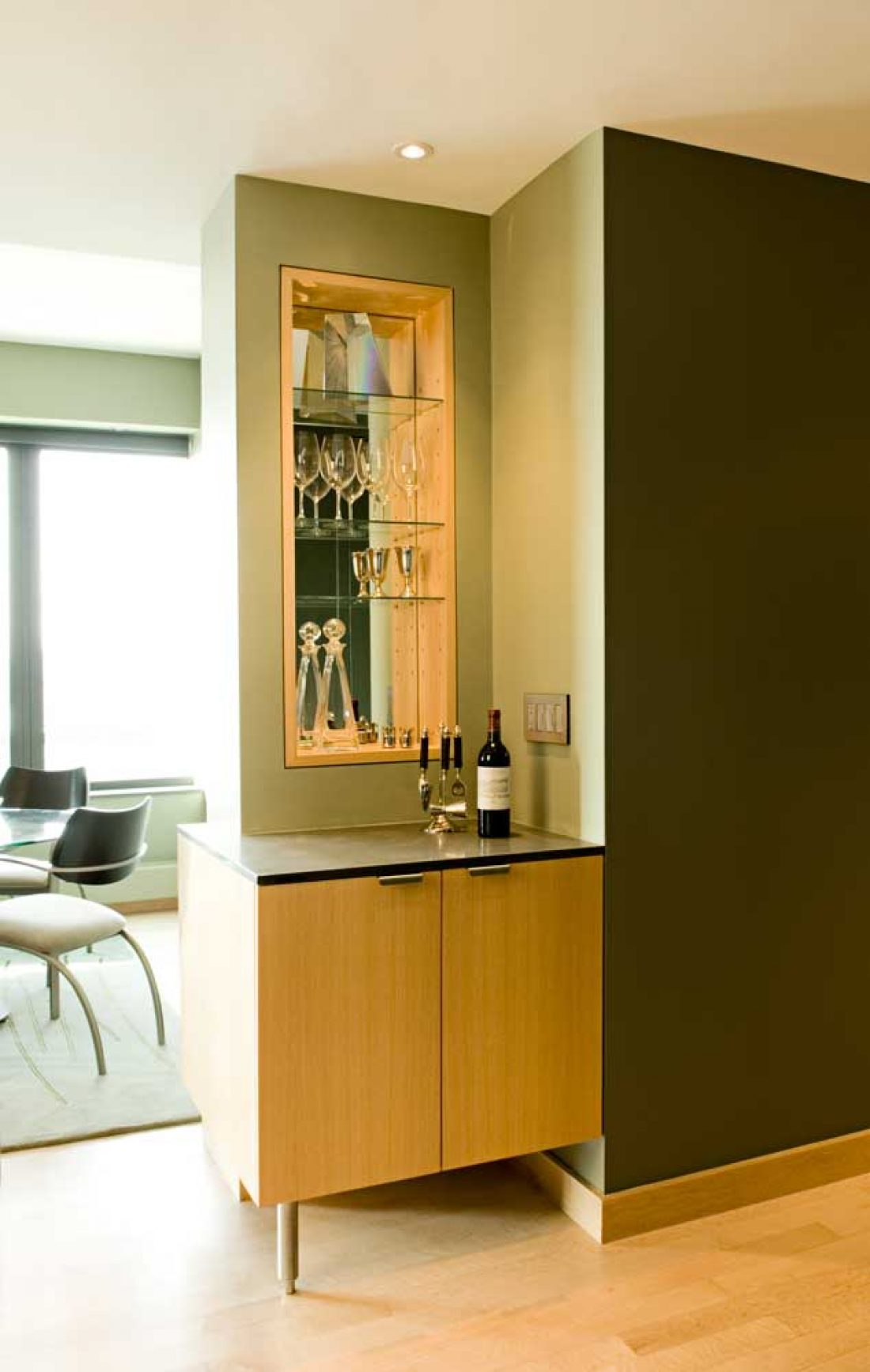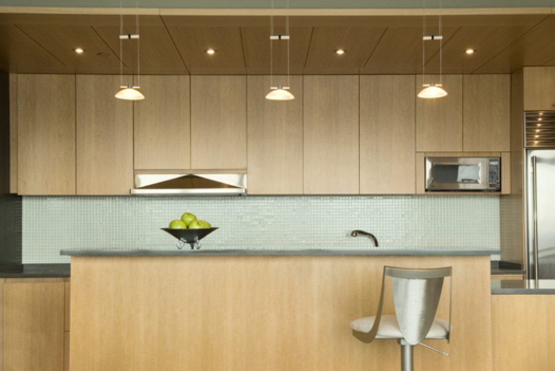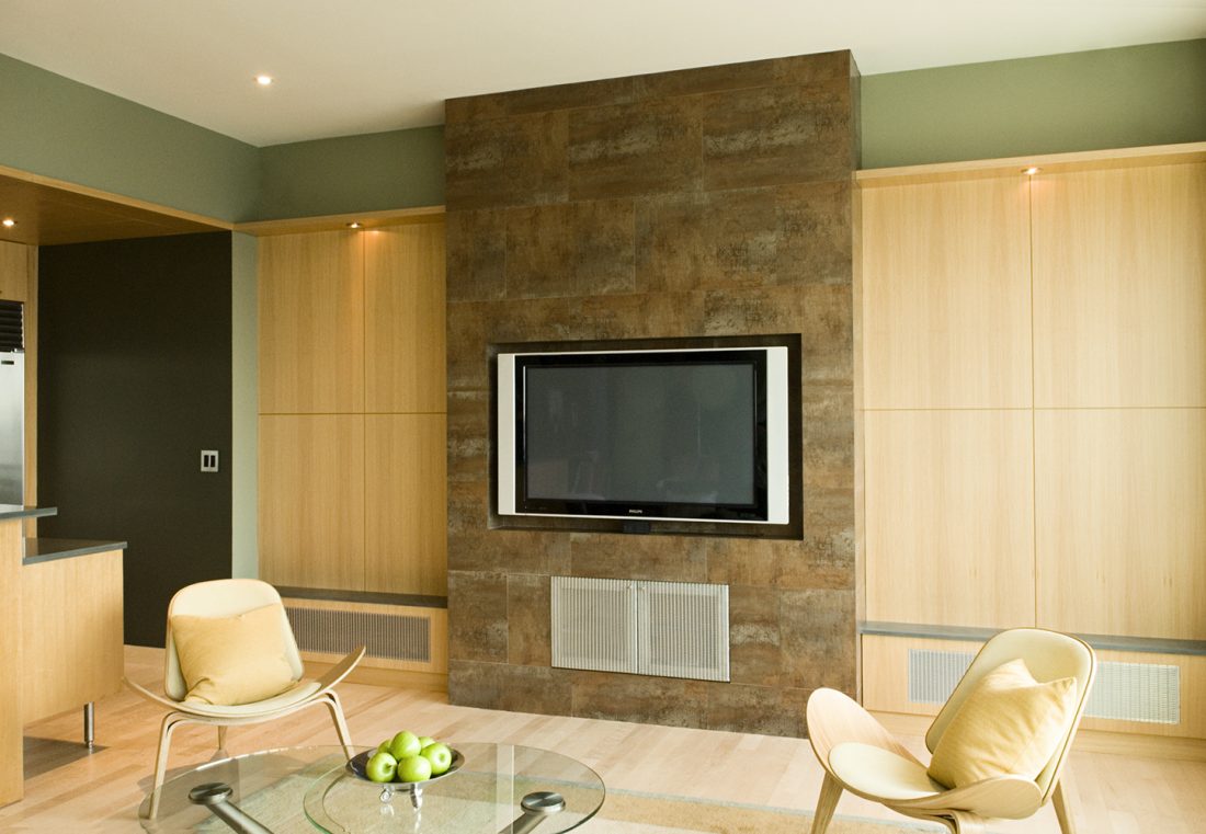 The challenge here was to make a special place out of a developer’s “vanilla” apartment. The solution was to outfit the kitchen with ceiling panels to match the existing cabinets. The end wall of the living room was turned into an ‘entertainment center’, given prominence by surrounding it with floor to ceiling tile.