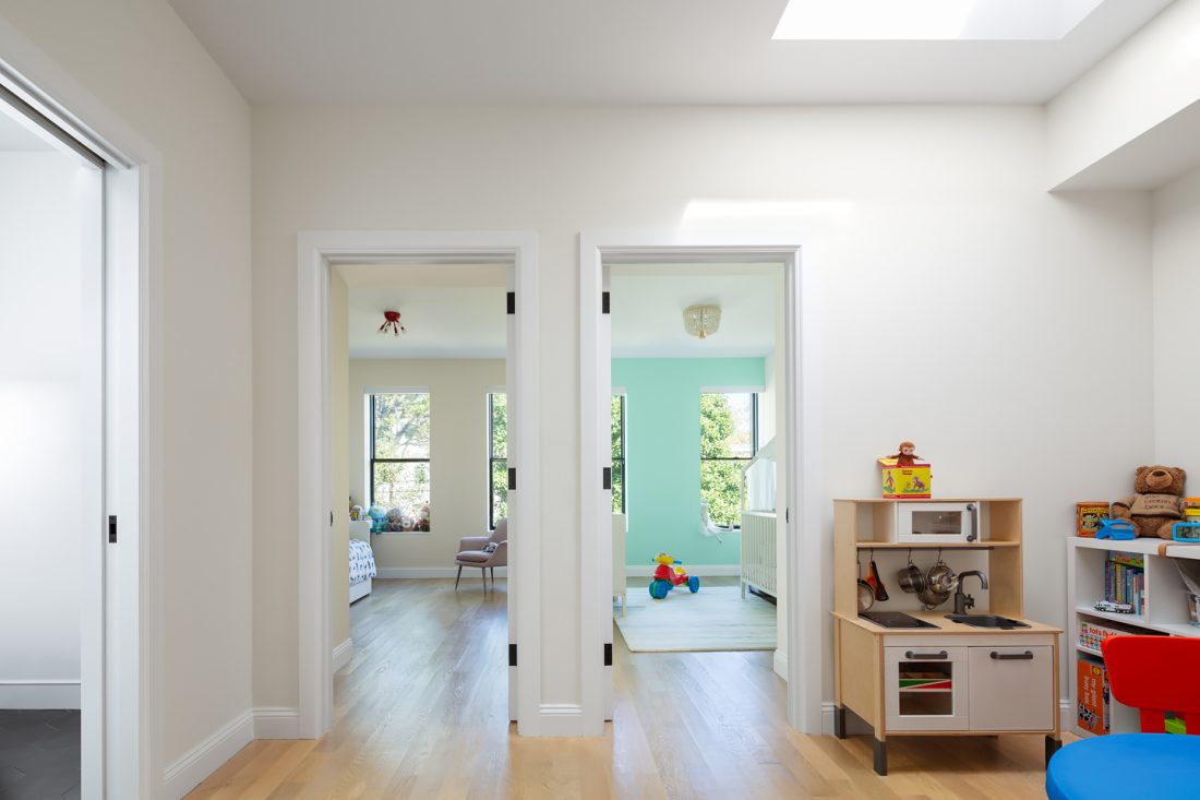 The kids bedrooms are entered through a shared playroom, encouraging joint play as well as independence.