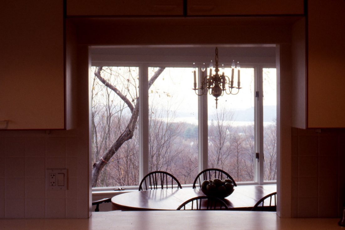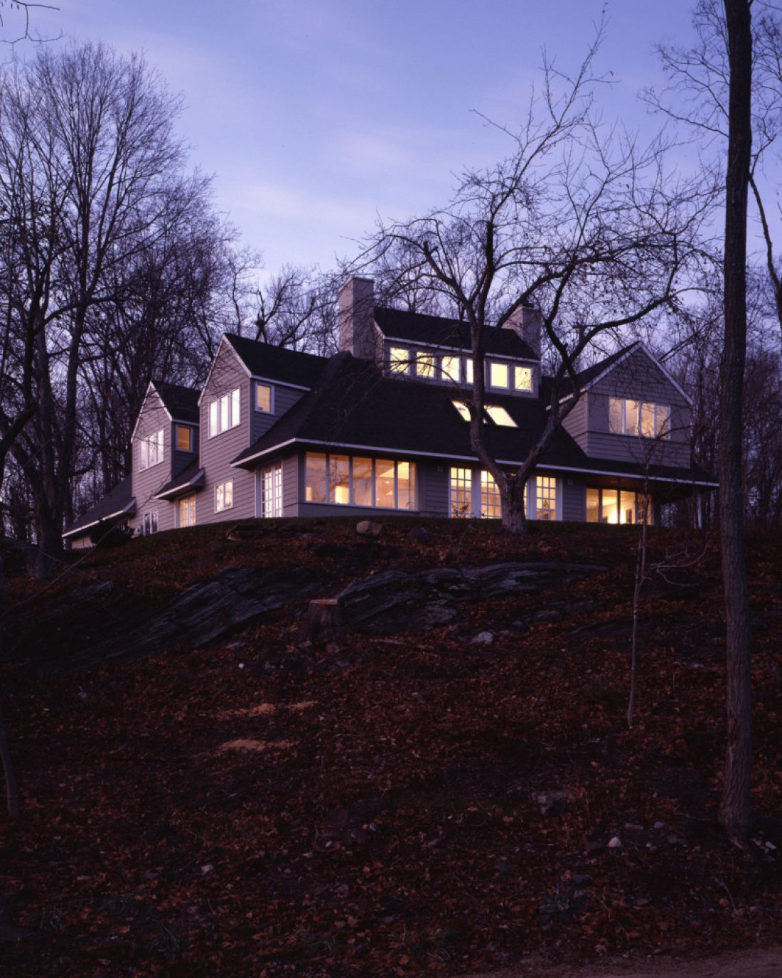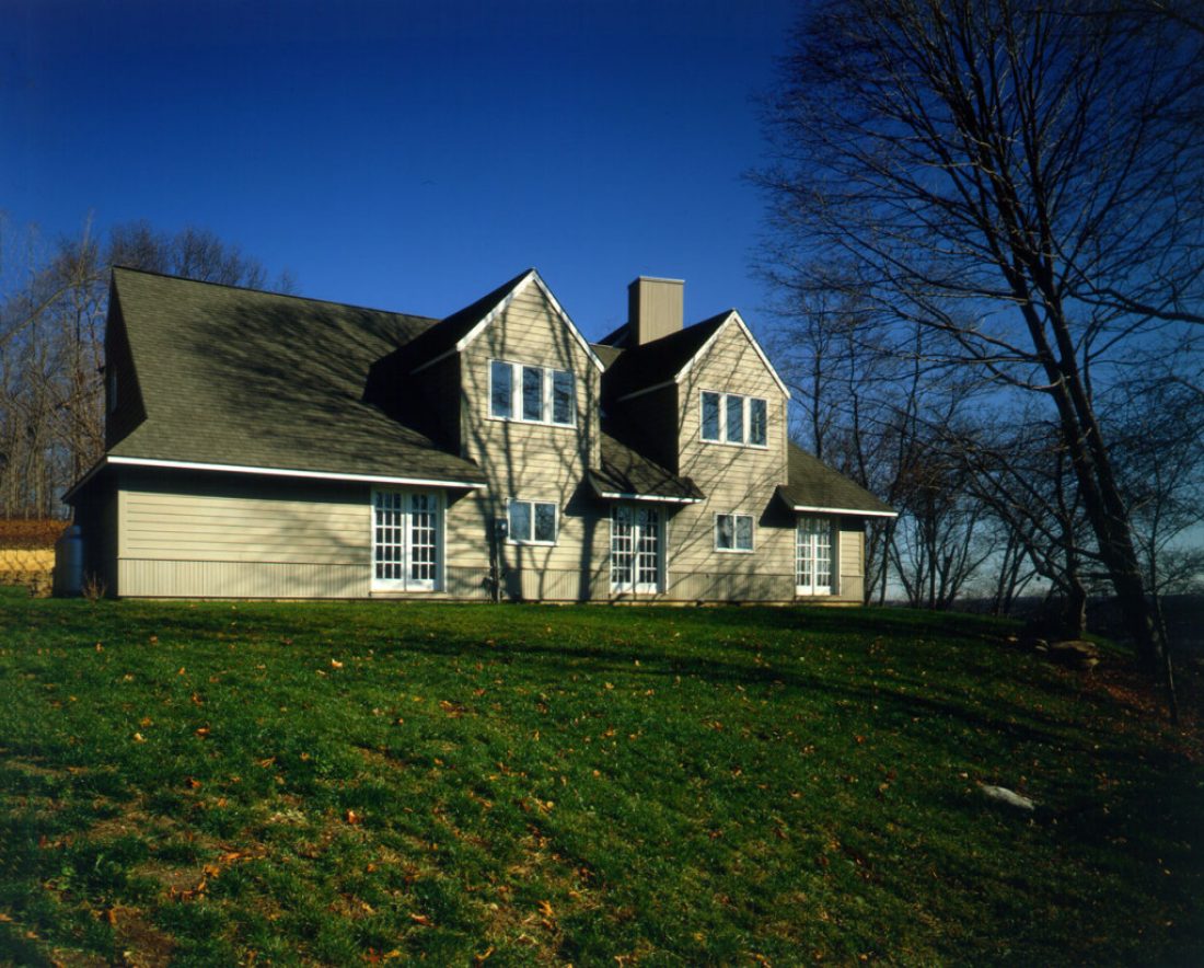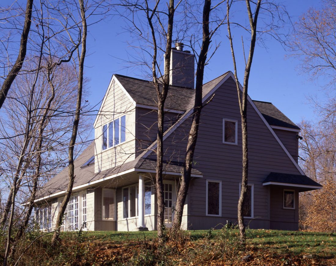 The Bennet house, overlooking the Connecticut River Valley, recalls regional vernacular architectural types such as sail lofts, churches, and barns. The use of dormer windows, the low eaves and natural siding are characteristic of this influence.