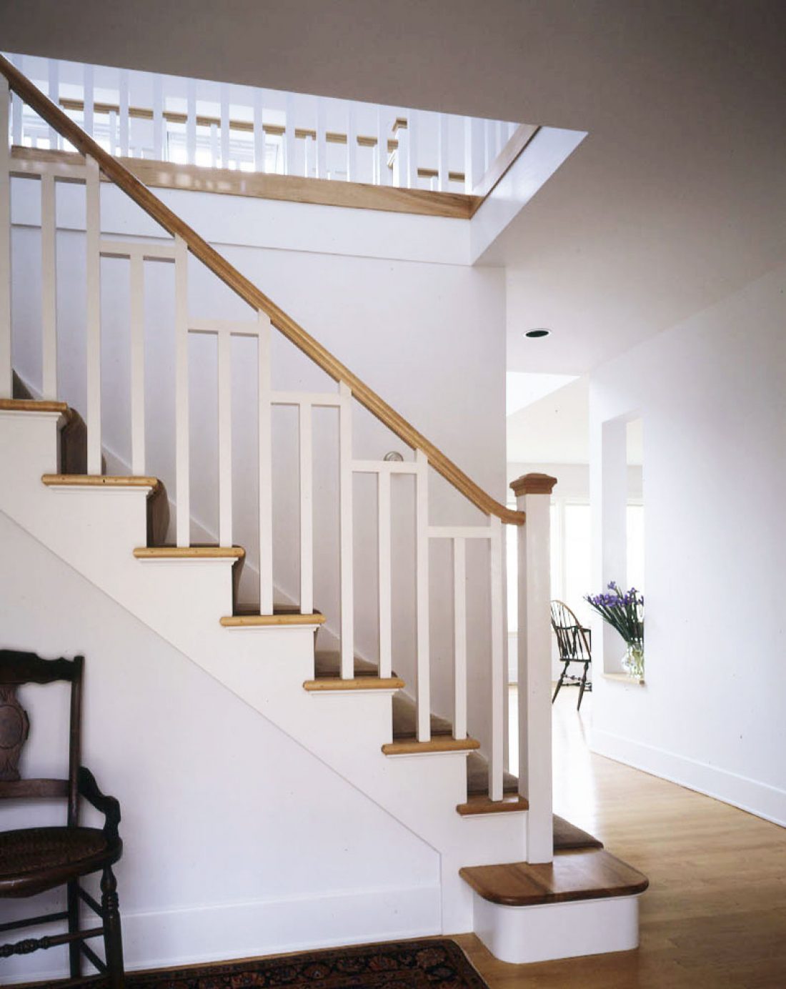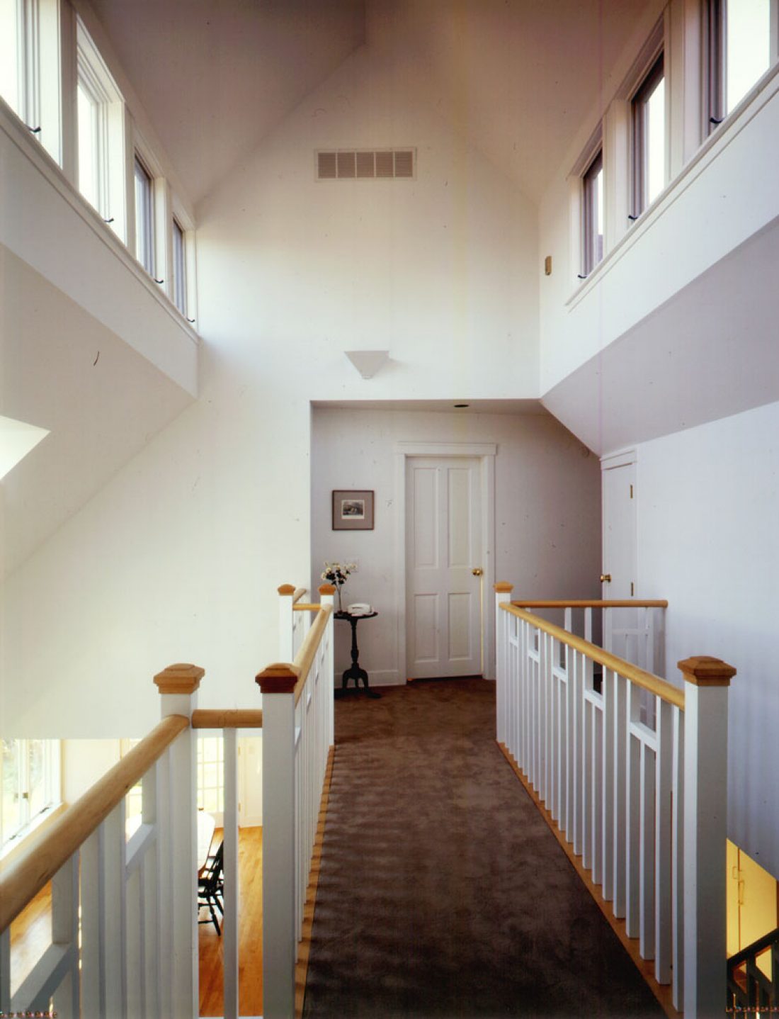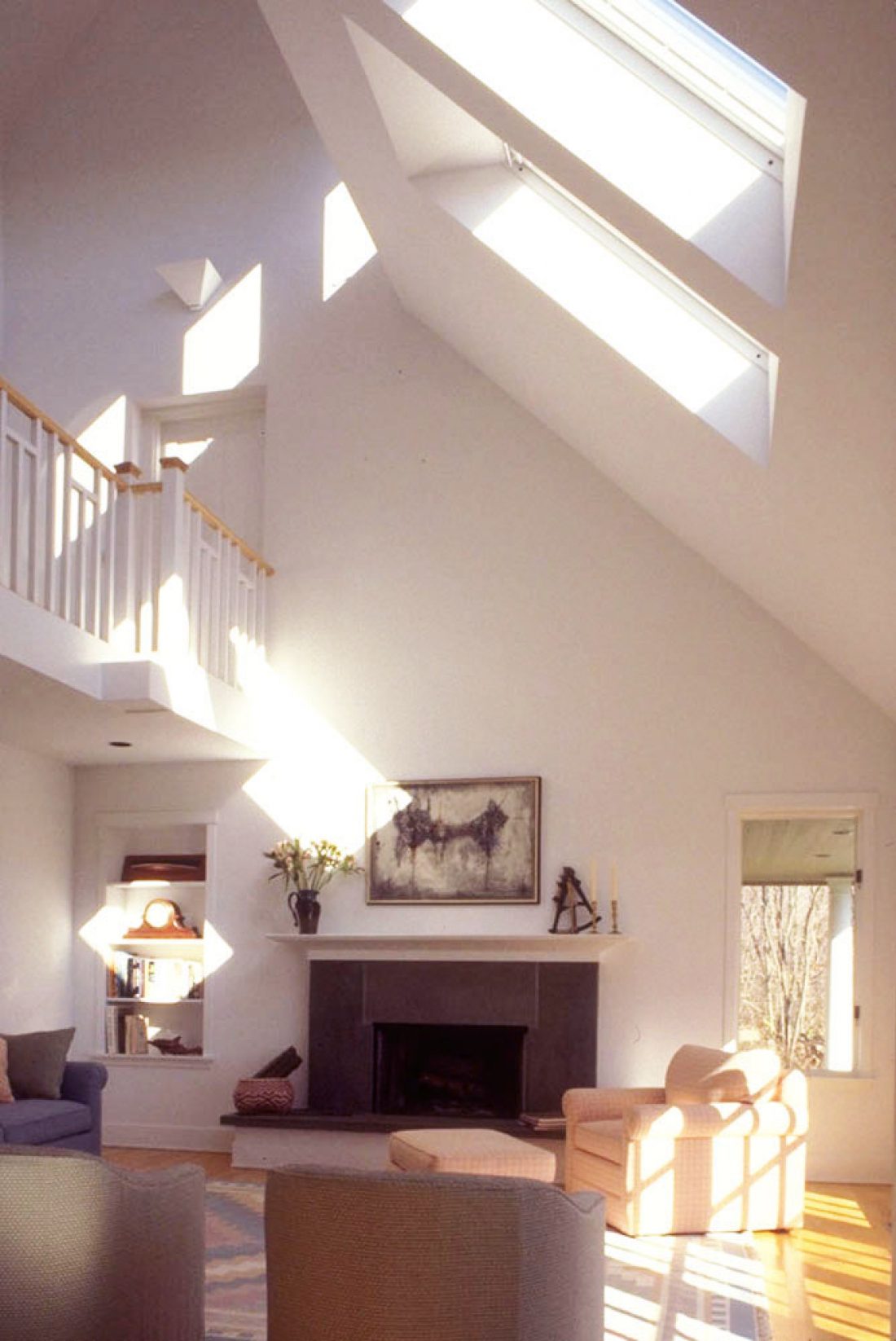 Public and private portions of the house are organized around the two-story living room and the stair hall, which are illuminated through a clerestory.
