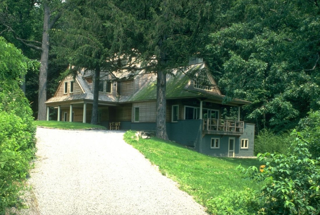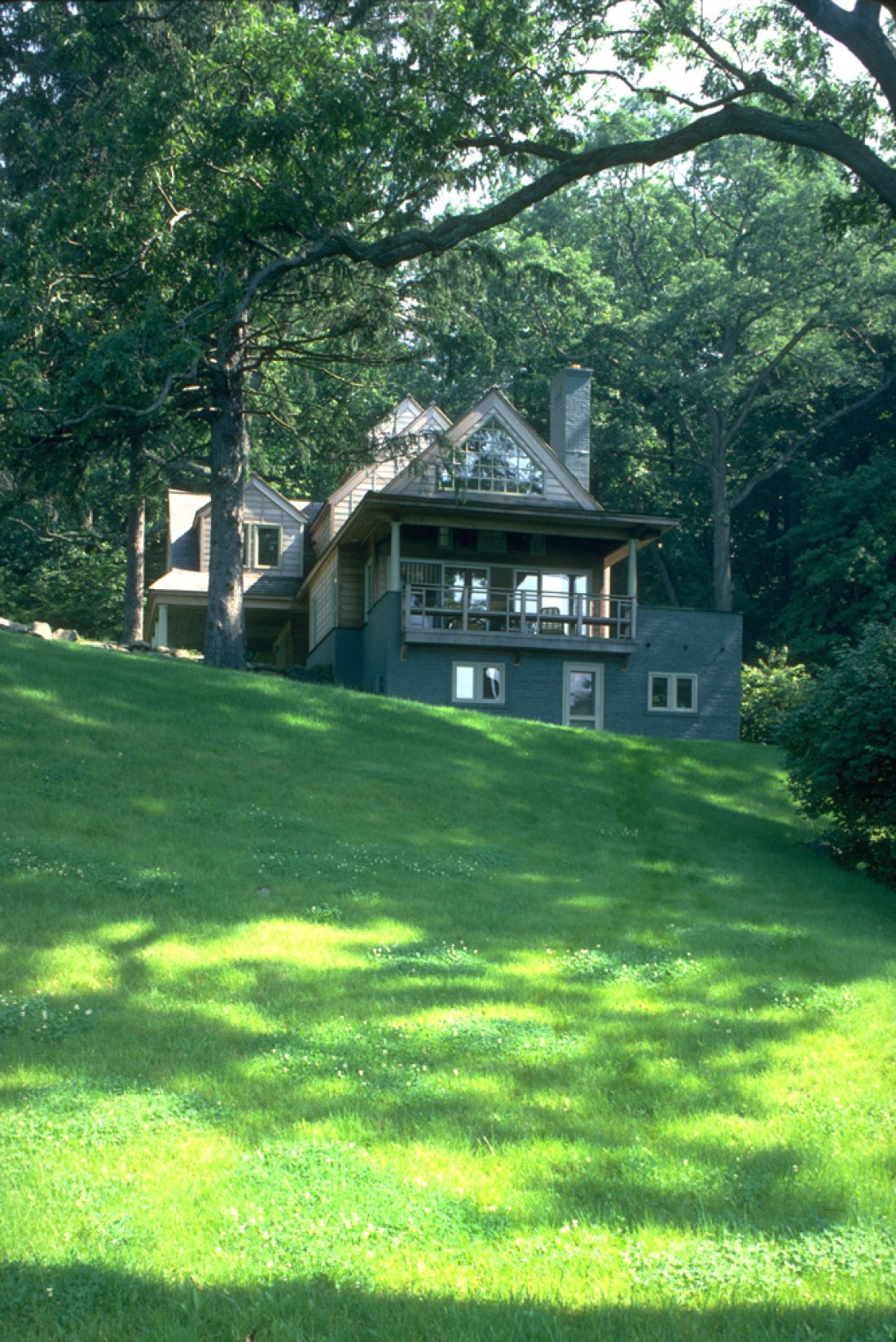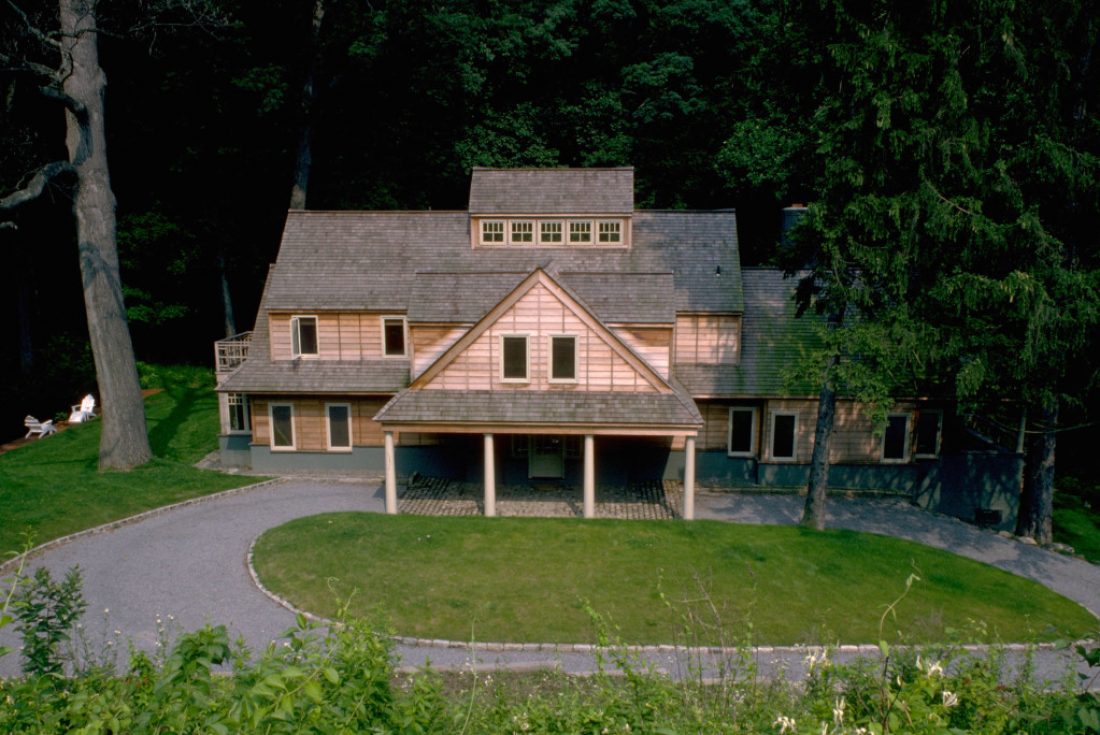 The North/South axis of the house is parallel to a ravine with views North of a pond and South to the Hudson River. A shorter cross-axis is defined by the kitchen and porte-cochere.