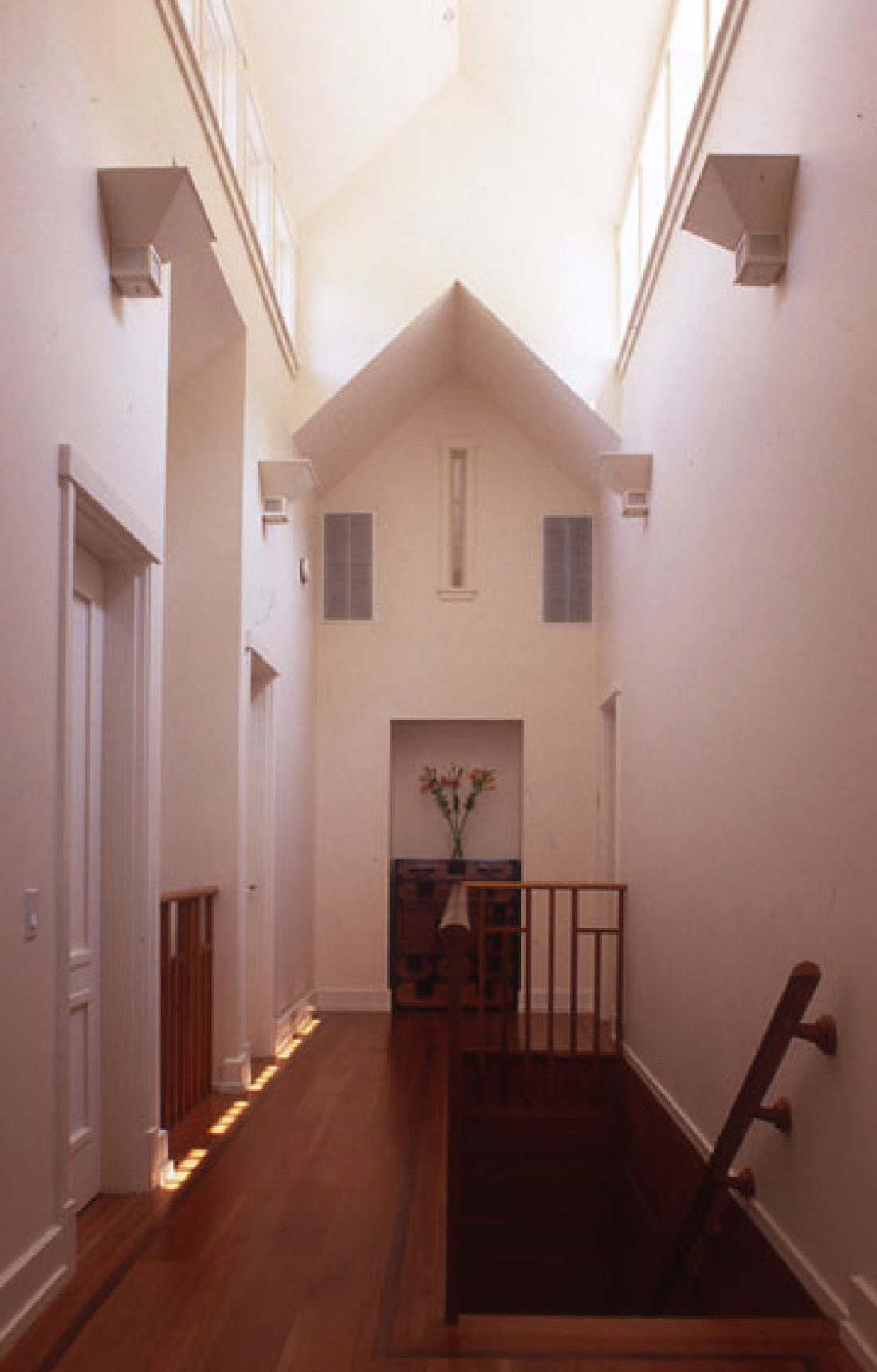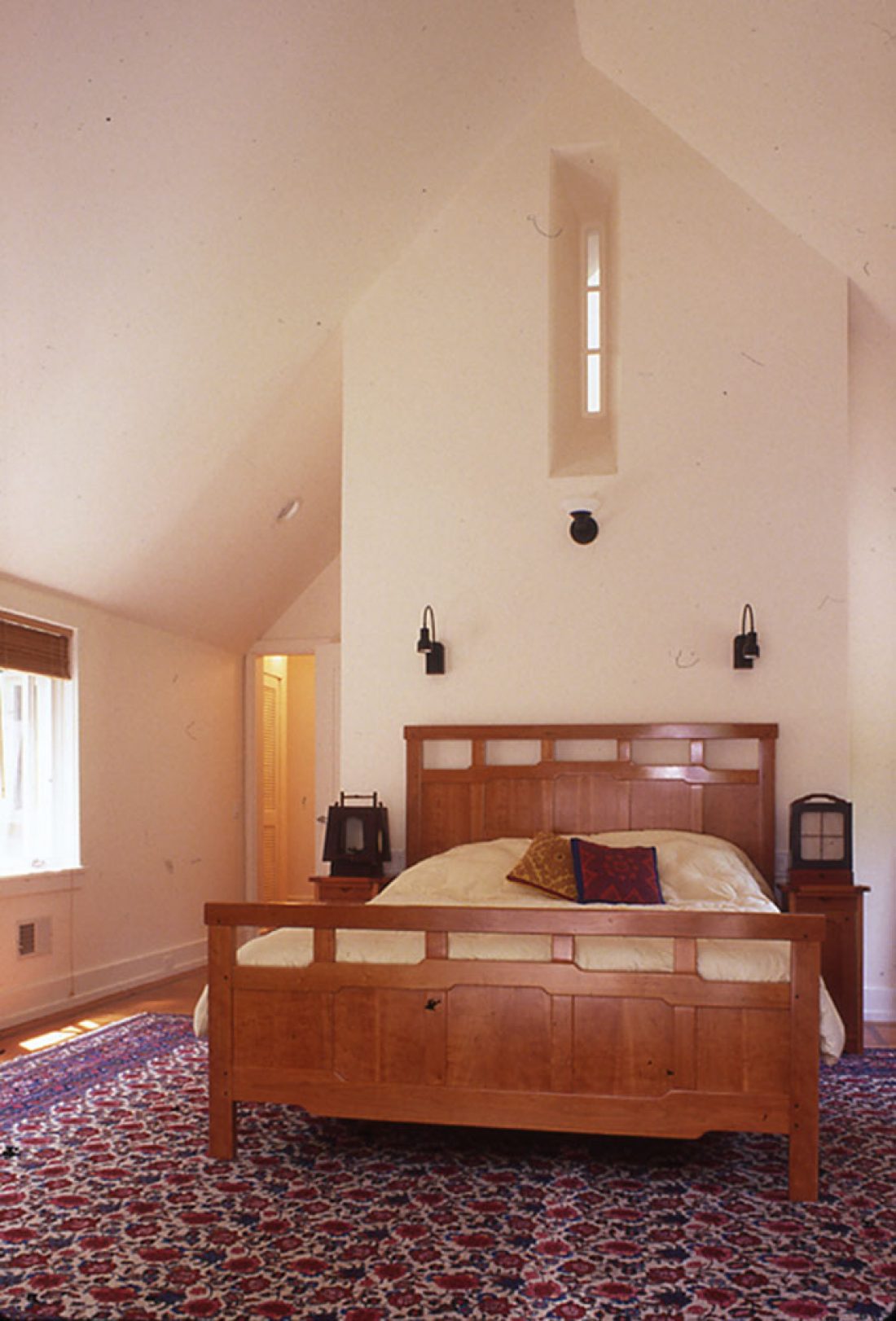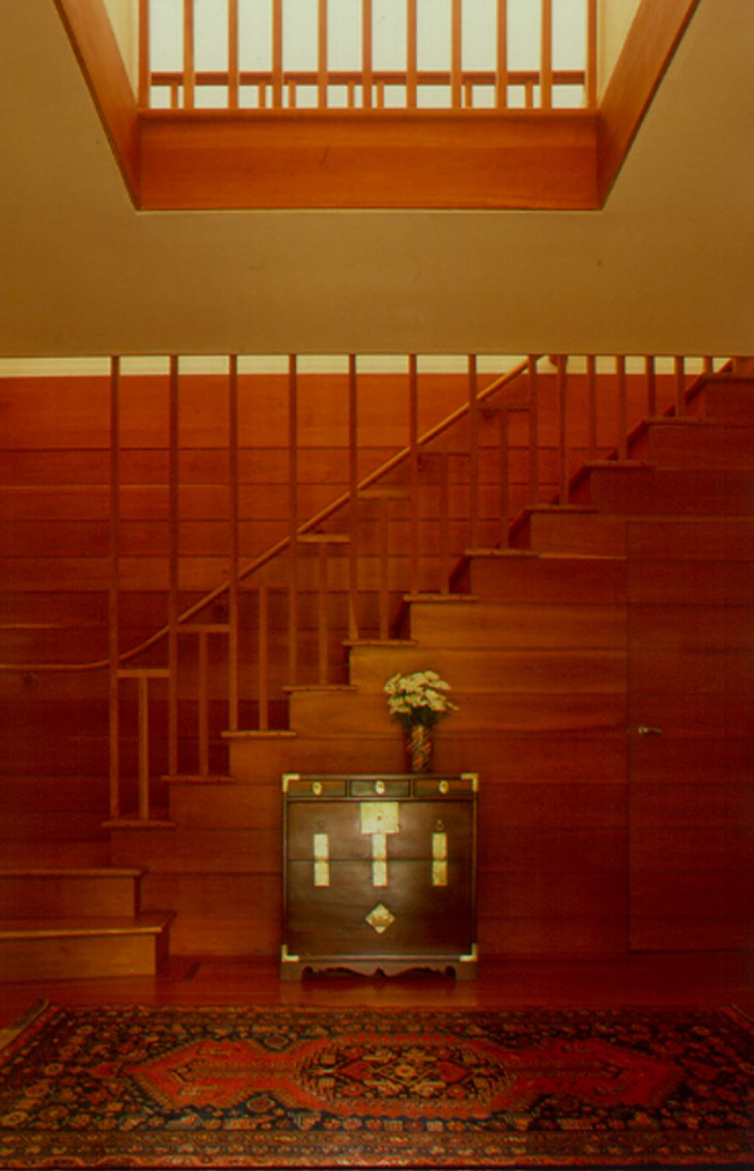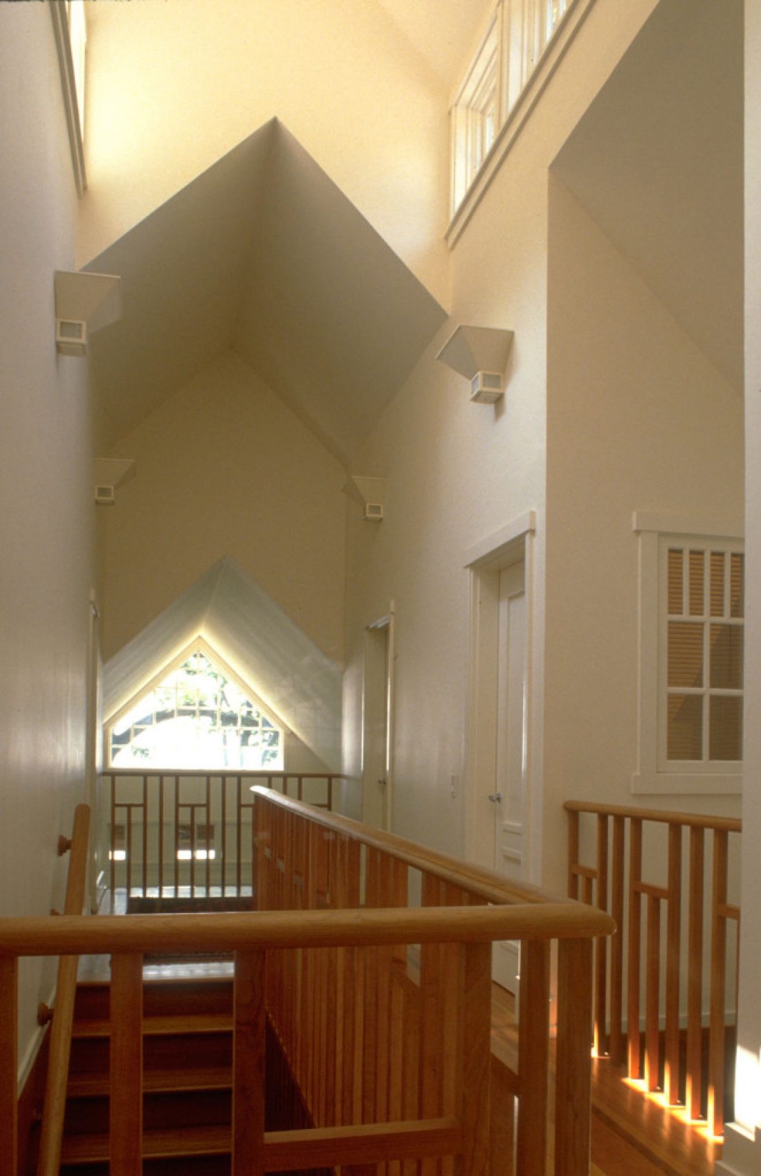 A cherry stair is at the intersection of these two axes. Interior windows from the children’s rooms above the porte-cochere playfully overlook the entry. The living/dining room extends its space to the outdoors by a 16′ biparting sliding door.