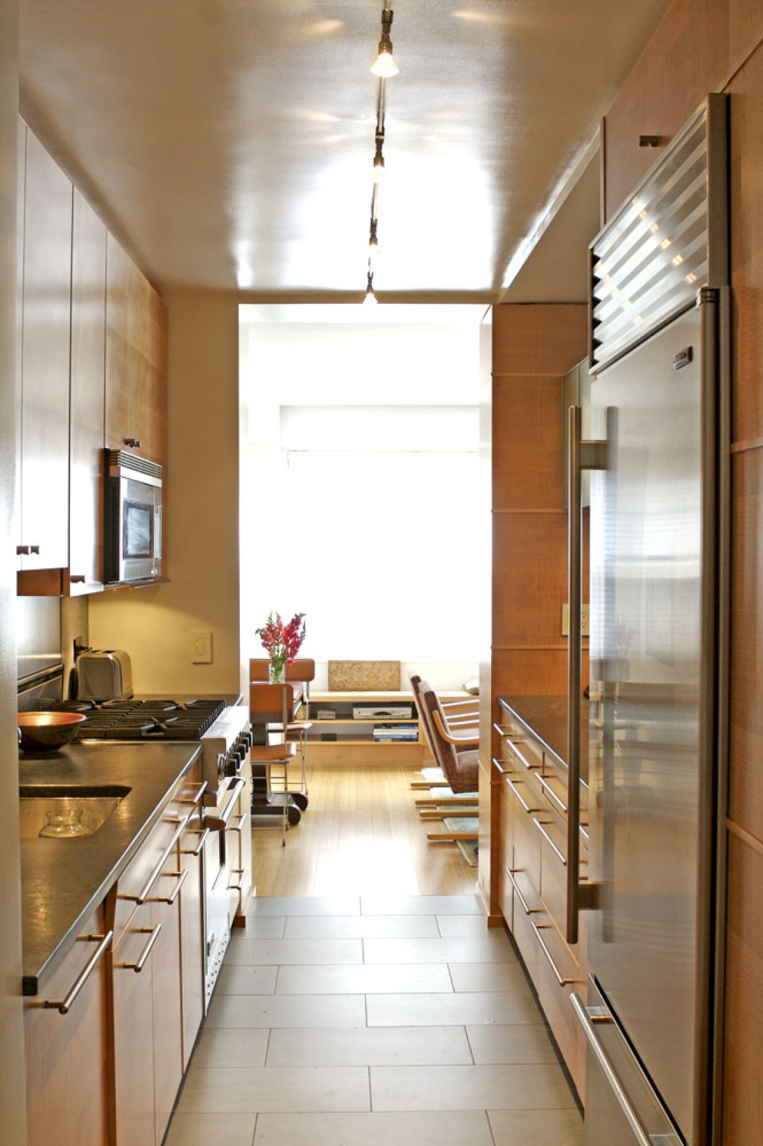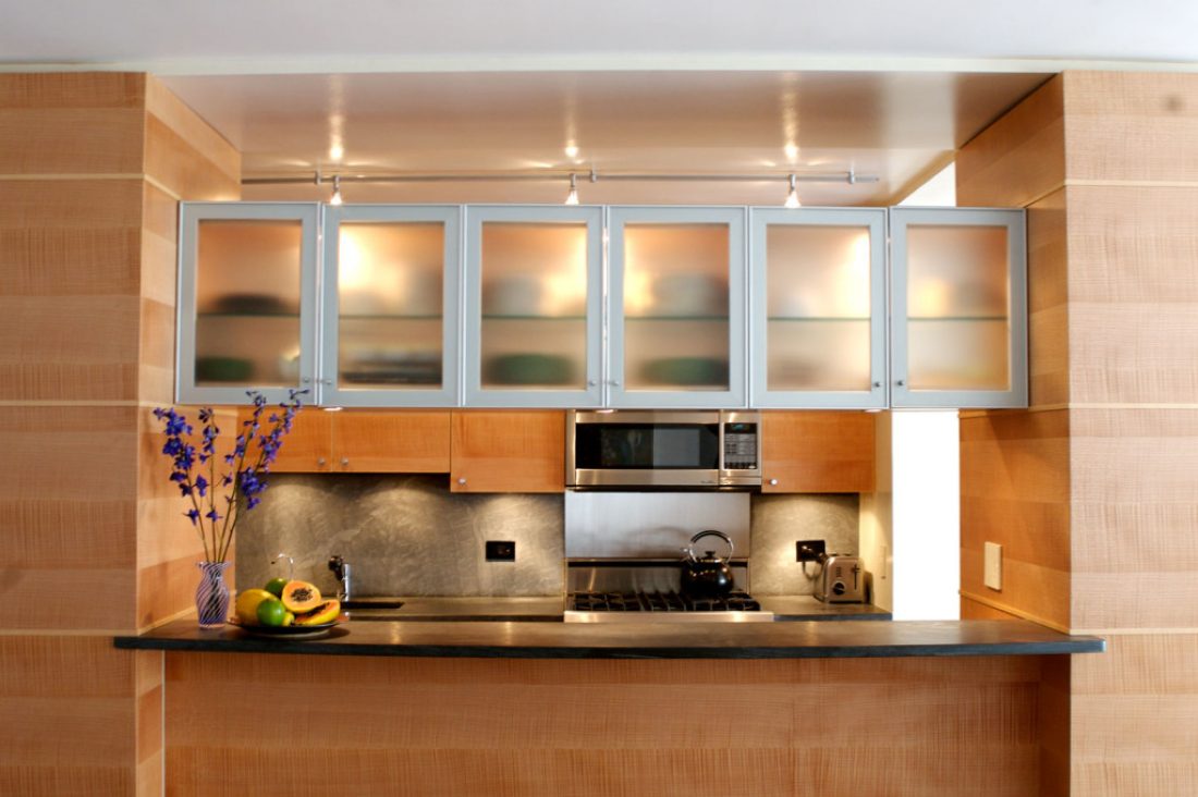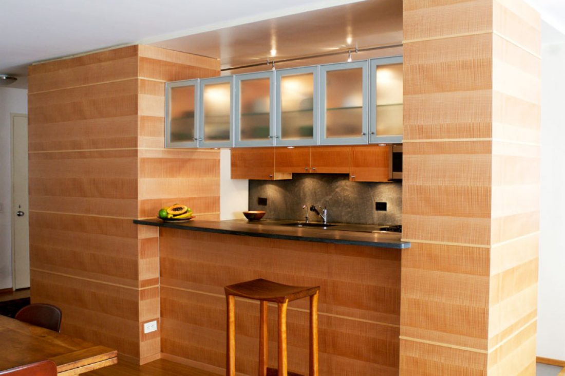 Simple moves created a downtown loft out of a dreary two bedroom postwar apartment. The expansive living spaces and a floating kitchen compensate for the low ceilings. One wall of the kitchen, wrapped in curly maple veneer, floats – making the living/dining space feel wide and spacious.