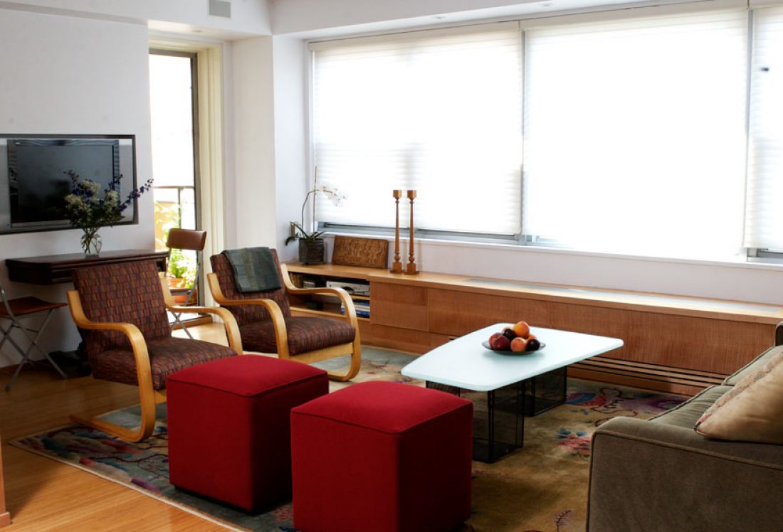 A second door was added to the second bedroom, mirroring the door to the terrace, so that this room becomes a swing space, part living room, part bedroom. The TV is recessed into the wall to create a focal point for the living area. Air conditioning equipment was built into a window seat unit. The new floors are bamboo and kitchen counters pietra cardoza limestone.